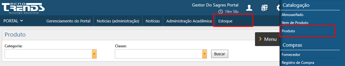Para acessar essa interface, o usuário deverá clicar sobre o menu superior em Estoque, depois em Menu localizado a esquerda da interface e selecionar Produto conforme destacado abaixo.