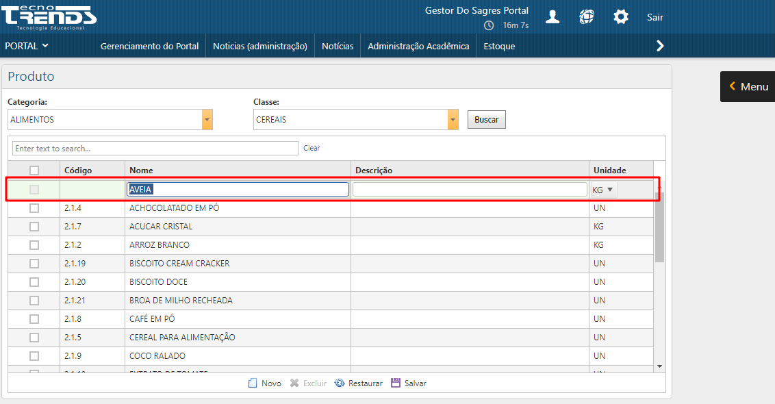 Caso deseje acrescentar um novo Produto com as respectivas Categoria e Classe, clique no botão Novo, e uma linha será inserida na tabela. Os campos Nome, Descrição e Unidade deverão ser preenchidos e depois clique no botão Salvar para que o sistema conserve as novas alterações.
