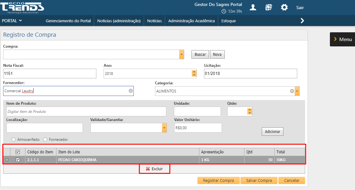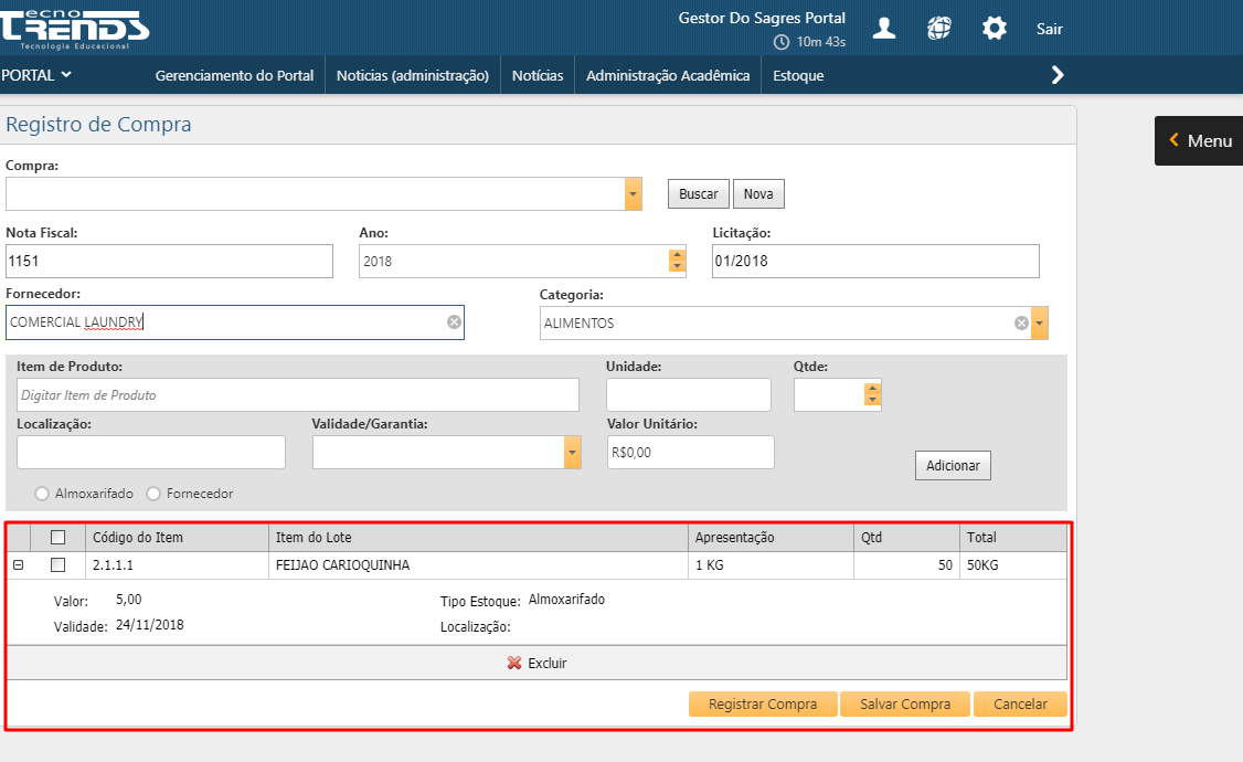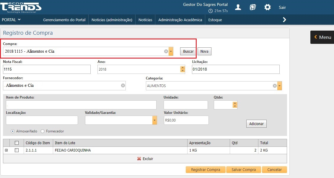 Esta funcionalidade permite aos usuários o cadastro de uma compra. O registro dessas informações deve ser a principal base de entrada de Produtos no Almoxarifado.