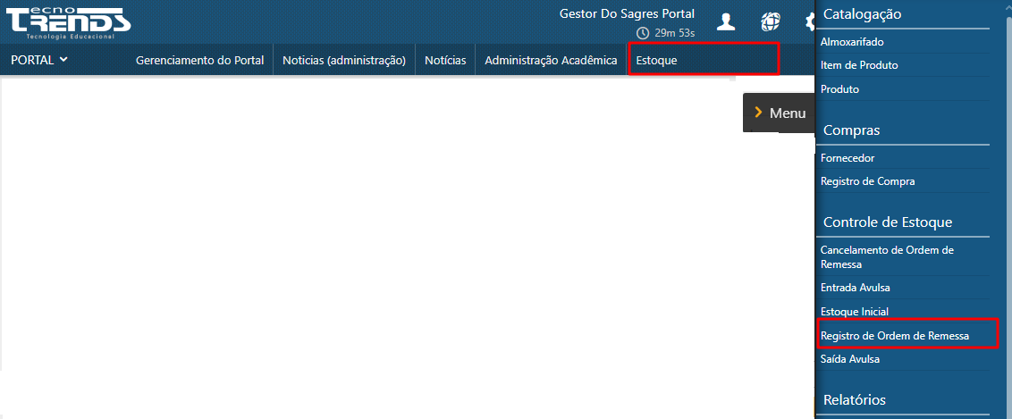 Para acessar essa interface, o usuário deverá clicar sobre o menu superior em Estoque, depois em Menu localizado a direita da interface e selecionar Registro de Ordem de Remessa conforme destacado abaixo.
