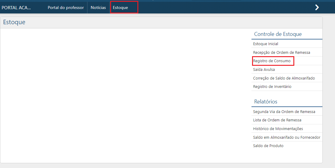 Para visualizar essa interface, o usuário deverá acessar o menu: Estoque > Controle de Estoque> Registro de Consumo, conforme ilustração abaixo.