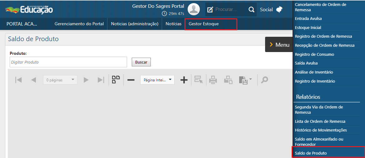 A interface retorna uma lista com os saldos dos itens dos Produtos em um determinado Almoxarifado por categoria, acessível pelo menu Relatórios > Saldo de Produto.