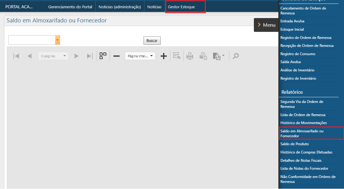 ​​Menu- Relatórios - Saldo em Almoxarif​​ado ou Fornecedor- Tela Principal