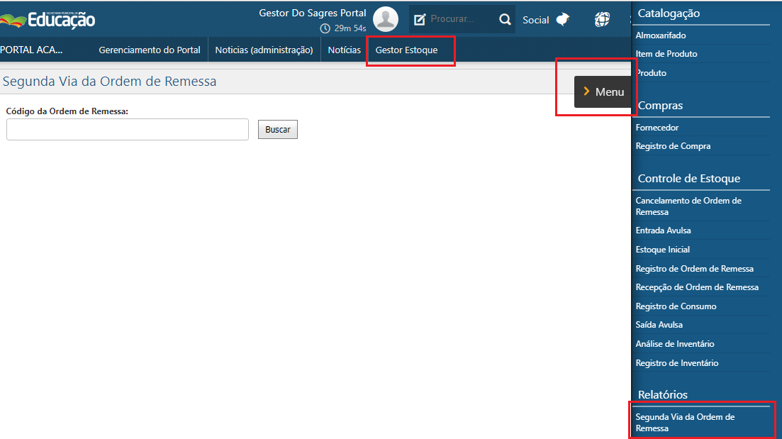 ​​Menu- Relatórios - Segunda Via da Ordem de Remessa