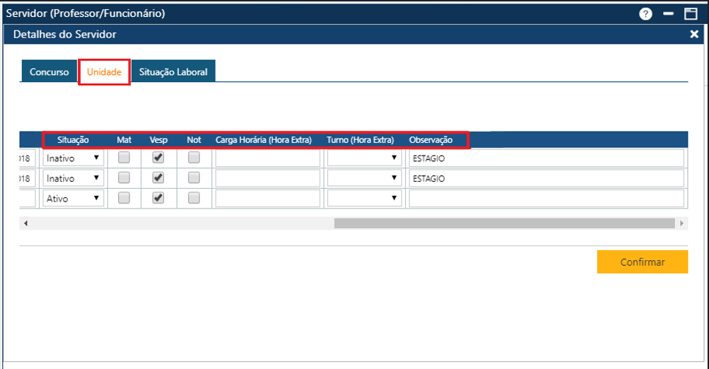 É obrigatório o preenchimento dos campos Unidade de Ensino, Vínculo, Função, Início, Situação (caso a situação do Servidor seja inativo, o campo Fim deve ser preenchido) e Turno (Matutino, Vespertino ou Noturno). Também é necessário que uma das Cargas Horárias sejam preenchidas: Carga Horária regular ou Carga Horária Extra.