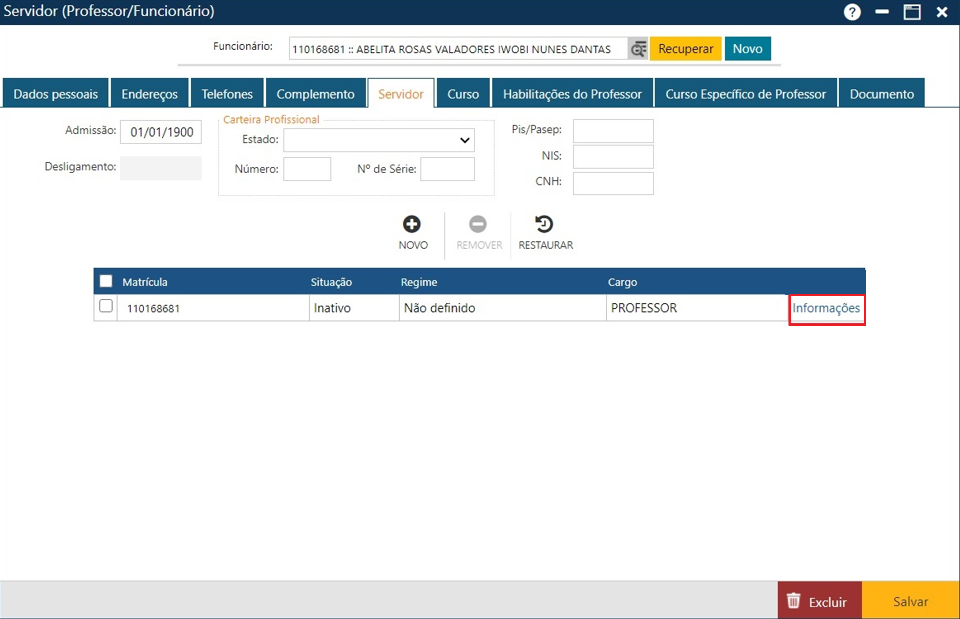 Na pasta Servidor, é preciso informar os dados do concurso/contrato do Servidor (Professor/Funcionário) na Instituição, ou seja, essas informações serão associadas diretamente à Instituição de Educação. Informações como data de admissão, data de desligamento, afastamentos e se o funcionário exerce atividades somente da Secretaria Central da Instituição serão cadastradas nesta pasta, associando-as ao cadastro do Funcionário na secretaria, independentemente de possuir vínculos com Unidades de Ensino ou não.