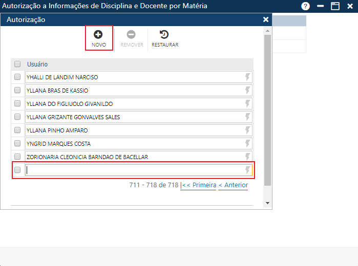 Acionando o botão Novo, o sistema permitirá incluir uma autorização. O botão Remover permitirá a remoção das autorizações já cadastradas. Por fim, o botão Restaurar permitirá a recuperação de autorizações removidas da interface (botão Remover), antes do usuário atualizar as informações no sistema utilizando o botão Confirmar.