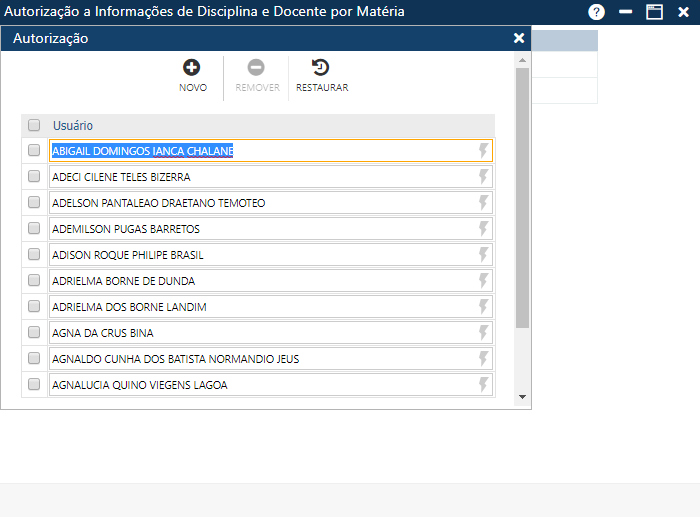 Exclusão e Restauração de uma Autorização a Informações de Disciplina e Docente por Matéria