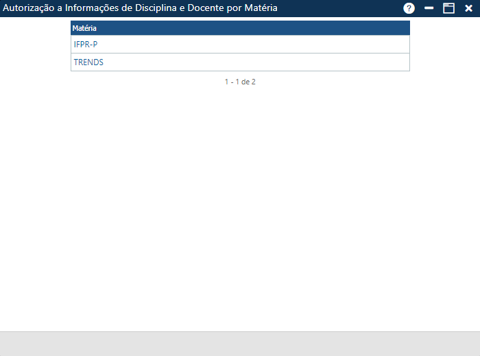 Ao clicar sobre o menu especificado acima, o sistema apresentará a interface Autorização a Informações de Disciplinas e Docentes por Matéria.