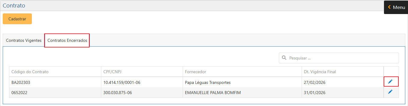 Para encerrar um contrato, o usuário deve clicar no botão editar de um Contrato em Vigência.