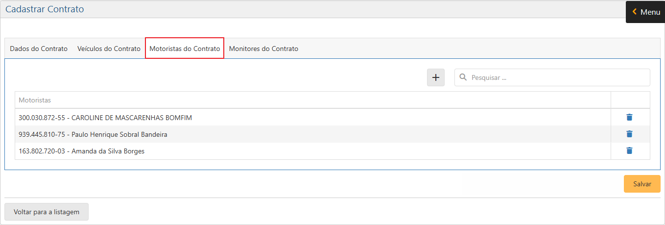Inclusão de Contrato - Motoristas do Contrato: