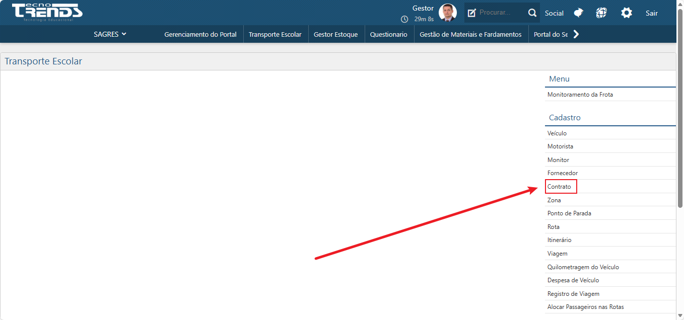 Para acessar a interface para o cadastro, o usuário deverá clicar sobre o menu Cadastro > Contrato, pelo Sagres Portal, no módulo de Transporte Escolar.