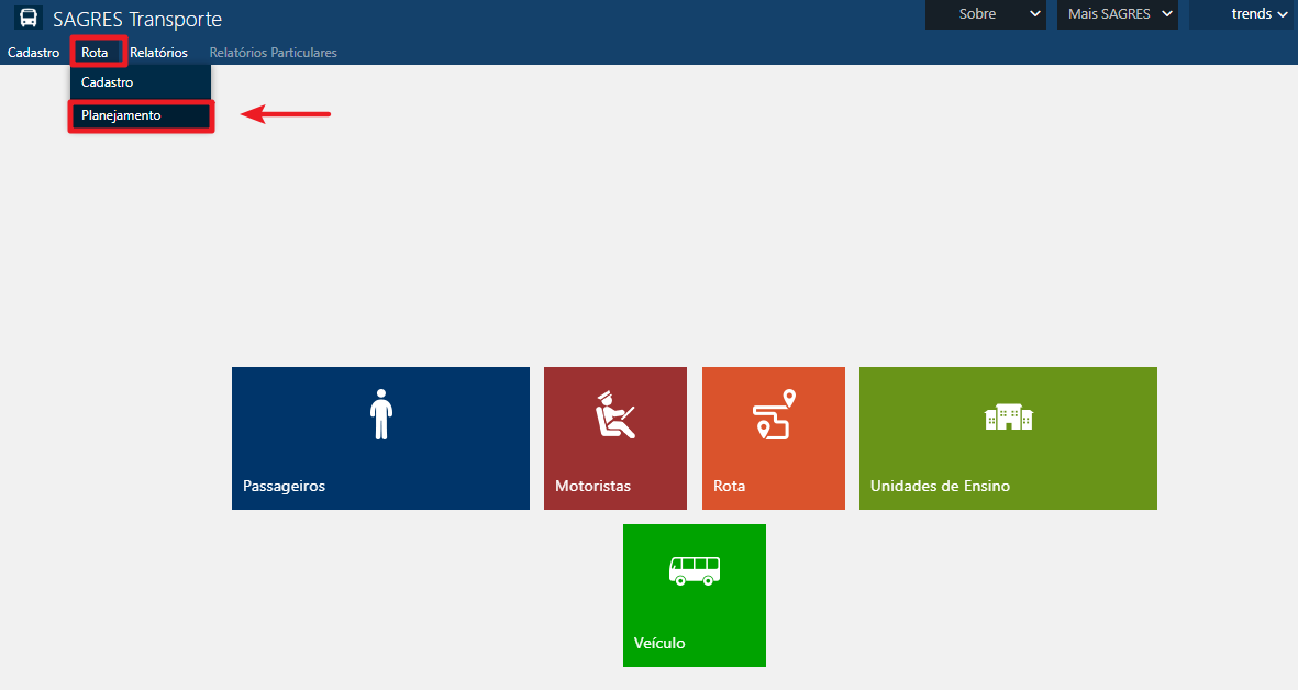 Para acessar essa interface, o usuário deverá clicar sobre o menu superior em Rota, depois no submenu Planejamento (conforme destacado na imagem abaixo).