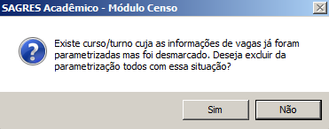 Os campos referentes às vagas ficarão disponíveis, permitindo ao usuário alterar qualquer valor. Os últimos valores salvos no final é que serão enviados no arquivo de exportação para o INEP. Se o usuário desmarcar um ou mais cursos já parametrizados, o sistema confirma se as parametrizações devem ser excluídas, como mostrado na imagem abaixo.