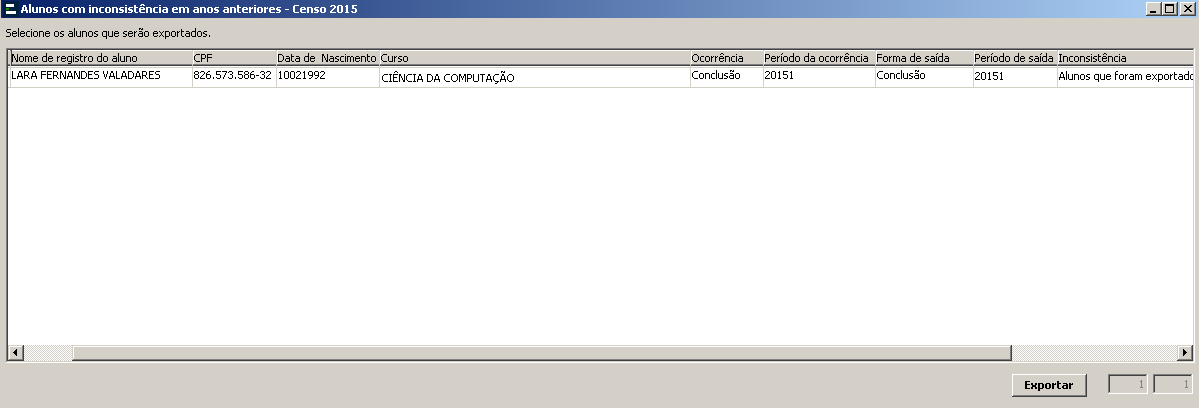 Se o usuário deseja exportar um ou mais alunos, ele deve acionar a função Exportar (barra de ferramentas, ou opção Alunos a exportar do menu Registro) na interface Relatório de Inconsistência com anos anteriores, e os mesmos alunos apontados no relatório de inconsistências aparecerão na interface de exportação (Alunos com inconsistências com anos anteriores), descrita abaixo.
