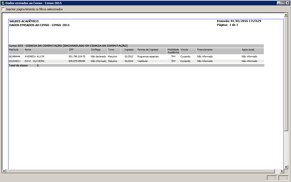 O relatório será exibido com uma lista de alunos com as seguintes informações: