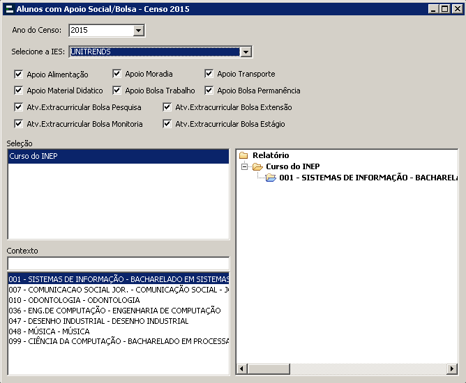 Esta interface permite a geração da lista de alunos que possuem algum apoio social e/ou bolsa, que faz parte da análise do Censo. O relatório pode ser emitido para cada ano do Censo (campo Ano do Censo), e por Instituição de Ensino Superior – IES (campo Selecione a IES). O usuário também pode indicar quais tipos de apoio social/bolsa (marcando os tipos desejados) e cursos (campos Seleção/Contexto) a seleção deve considerar.