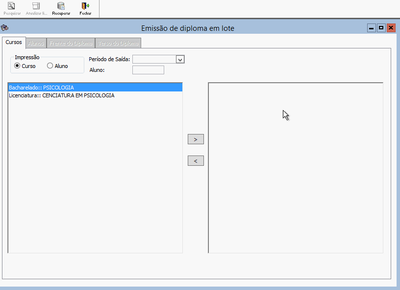 , selecionar o Período de Saída dos alunos que deseja emitir o diploma, clicar no curso desejado e utilizar as setas