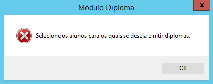 - Caso os alunos que deseja emitir os diplomas não seja informado na interface Alunos > Configurações para a frente, a mensagem abaixo será exibida: