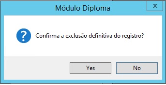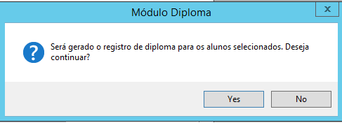 , a mensagem abaixo será exibida. Caso o usuário deseje continuar com a operação, deverá clicar em “Yes” para que o sistema gere o registro do Aluno no Livro de Registro de Diploma.