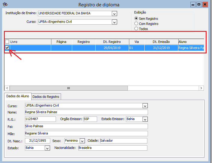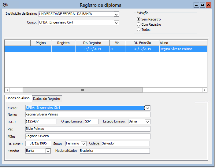 (ou teclar CTRL + R) para que o sistema possa retornar com as informações.- Sem Registro: retorna os alunos cadastrados, mas que não possuem registro no Livro de Diplomas de Outras Instituições;