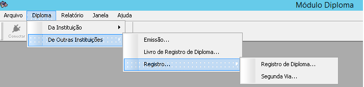 É possível acessar essa interface através do menu Diploma > Outras Instituição > Registro > Registro de Diploma, do SAGRES Diploma, conforme figura abaixo: