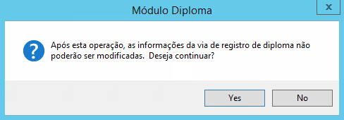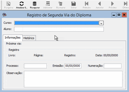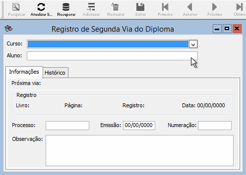 As informações registradas na tela Registro de Segunda Via do Diploma são utilizadas para cadastrar uma 2ª via do registro de diplomas de alunos graduados de uma Instituição, permitindo assim controle dos registros de vias.