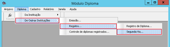 O acesso à interface Segunda Via do Diploma é feito através do menu Diploma > De Outras Instituições > Registro > Segunda Via, do SAGRES Diploma.