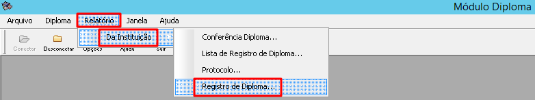 O acesso à interface Registro de Diploma é feito através do menu: Relatório > Da Instituição > Registro de Diploma.