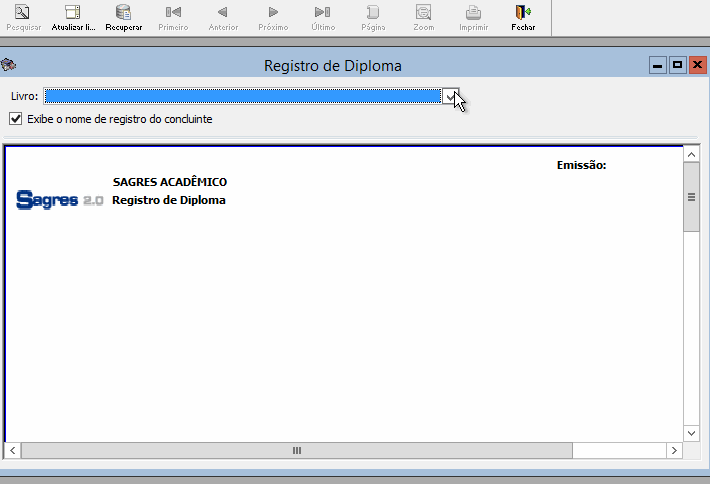 Para imprimir um Relatório de Diploma o usuário deverá efetuar os passos descritos abaixo, após recuperar o relatório (explicado no tópico acima).