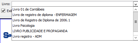Livro – O Usuário deverá selecionar o livro de Registro desejado. O sistema lista a tabela de Livros de Registros cadastrados no sistema conforme exemplo abaixo.