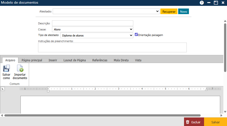 Esta funcionalidade permite que sejam criados os diversos modelos de Diplomas da Instituição.
