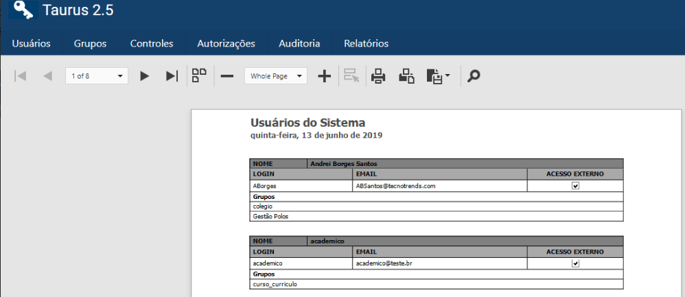 Ao acessar a interface indicada no menu acima, a aplicação retornará um relatório contendo os Usuários e seus dados cadastrados no Taurus: