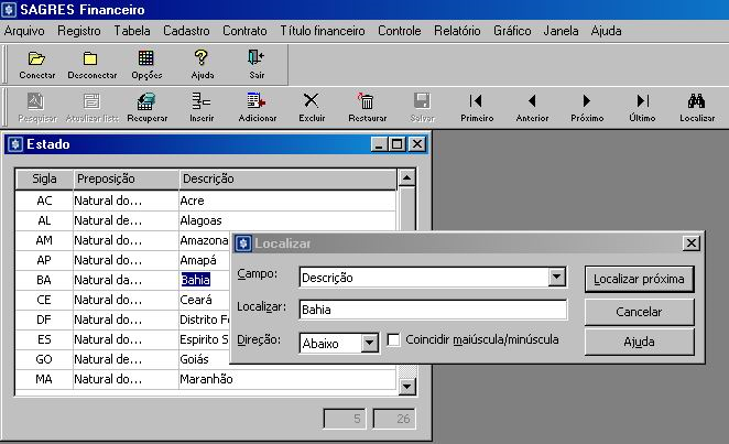 A função Pesquisar, presente no menu Registro e na Barra de Ferramentas, irá retornar os dados de um determinado campo. Caso digite um ou mais caracteres antes de acionar este botão, a função irá pesquisar as informações que possuem esta sequência de caracteres no banco de dados.