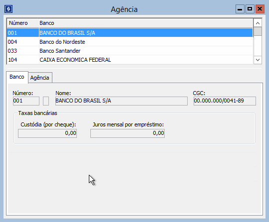 Para excluir uma agência, selecione o Banco ao qual ela pertence e acesse a lista de Agências. Lá, clique sobre a agência que deve ser excluída, então acione a função Excluir através da barra de tarefas ou no menu Registro e depois a função Salvar através dos mesmos meios.
