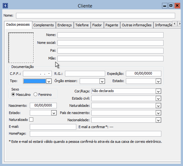 Para adicionar uma foto no cadastro do cliente, o usuário deve clicar com o botão direito do mouse sobre a tela a moldura de foto 3×4, escolher a opção Inserir foto e carregar alguma foto salva no computador.