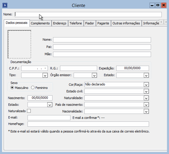 Ao acessar o menu Cadastro > Cliente > Pessoa física, o sistema exibirá a interface Cliente pessoa física.