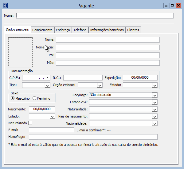 O cadastro de Clientes feito nesta interface é semelhante ao que é feito no tópico Cadastro de Pagante Pessoa Física.