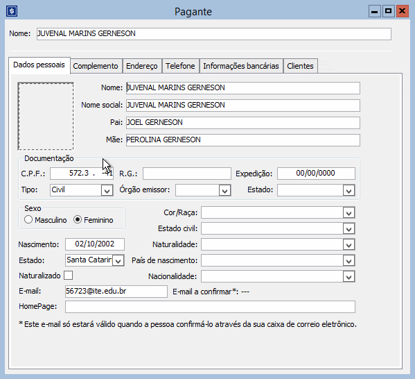 Para adicionar uma foto ao cadastro do pagante, é preciso clicar com o botão direito do mouse no campo de foto 3×4, e escolher a opção Inserir foto. Após isso, selecione a imagem desejada para que esta apareça no campo da foto.