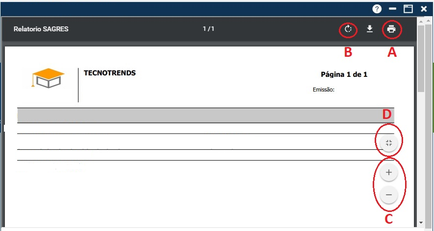 - Botão D: ajustar a visualização do relatório à largura ou à página.