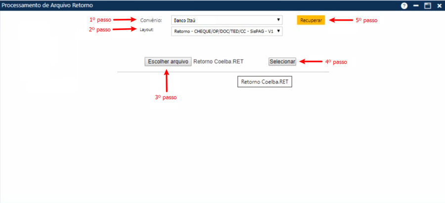 Para processar os arquivos, selecione a instituição bancária conveniada no campo convênio e o layout do arquivo que será carregado. Em seguida, acione o botão Escolher arquivo, para localizar o arquivo .RET em sua máquina. Por fim, acione o botão Recuperar.
