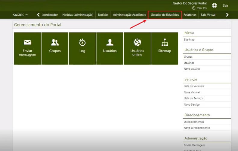 Após informar seus dados e clicar em ENTRAR, caso a autenticação seja bem sucedida, o usuário será redirecionado para a interface inicial do SAGRES Portal. Para acessar o Gerador de Relatórios, selecione no menu a opção correspondente como indicado na imagem a seguir: