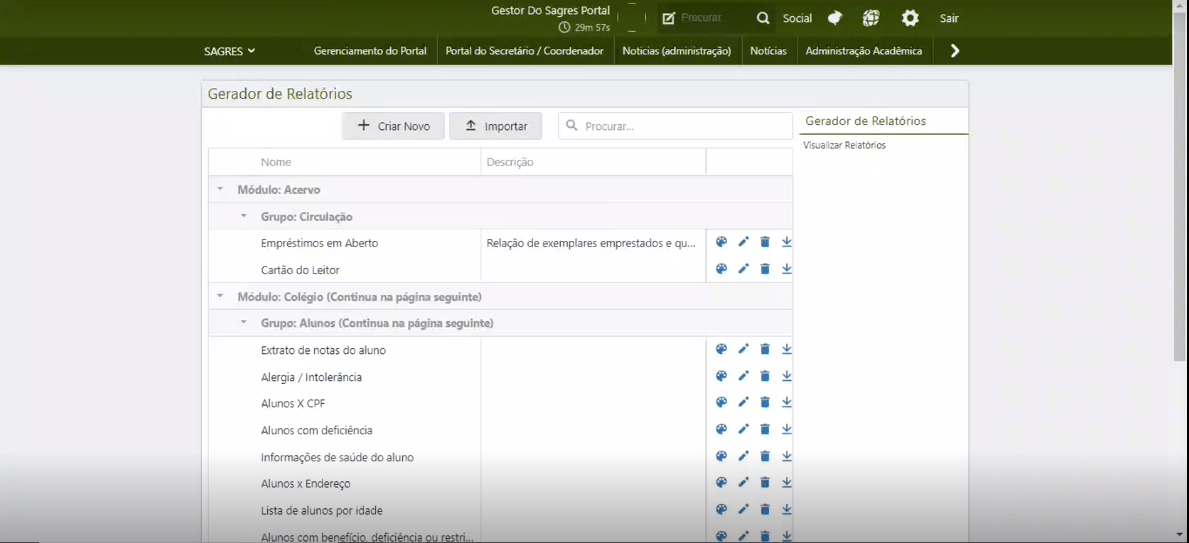 A ferramenta de criação de relatórios requer certo conhecimento técnico específico e, por isso, recomendam-se que essa operação seja realizada por um colaborador do setor de TI da instituição.