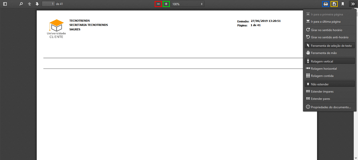 • Botão circulado em Amarelo: Ajustar a visualização do relatório à largura ou a página.