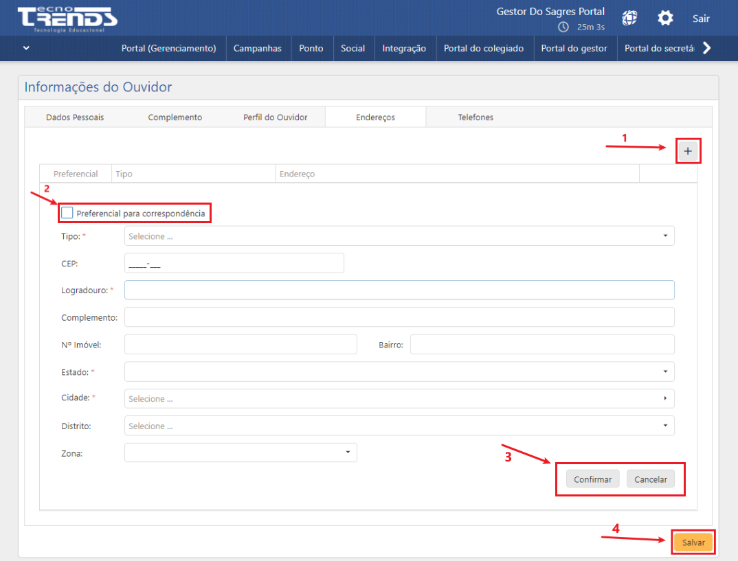 - Para confirmar as informações adicionadas, acione o botão Confirmar (seta 3). Dessa forma, diversos endereços podem ser adicionados antes da finalização da operação. Para desfazer as alterações, acione o botão Cancelar e a opção será excluída;