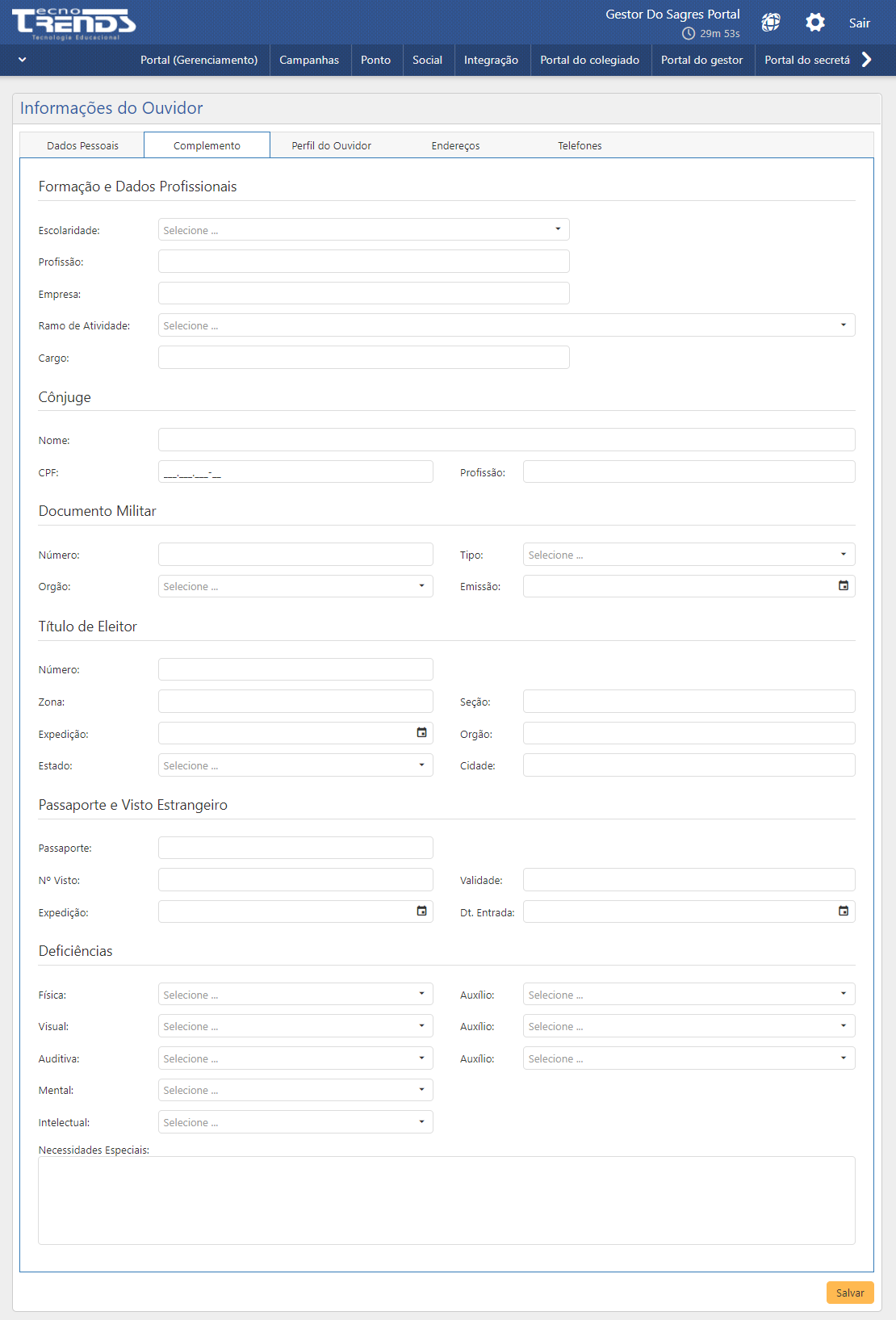 - Necessidades Especiais: neste campo podem ser inseridas quaisquer outras necessidades especiais que o ouvidor possua para que possa exercer as suas atividades