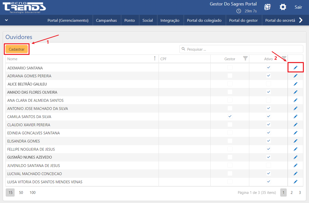 Nessa página, existem diversas ações que permitem o cadastro, busca e gerenciamento de ouvidores cadastrados e, ainda, a navegação através dos nomes presentes na lista. Abaixo, serão descritas cada funcionalidade e suas respectivas funções na interface.