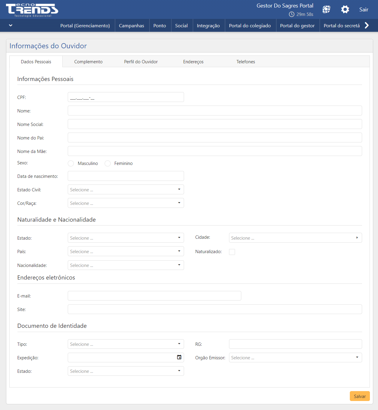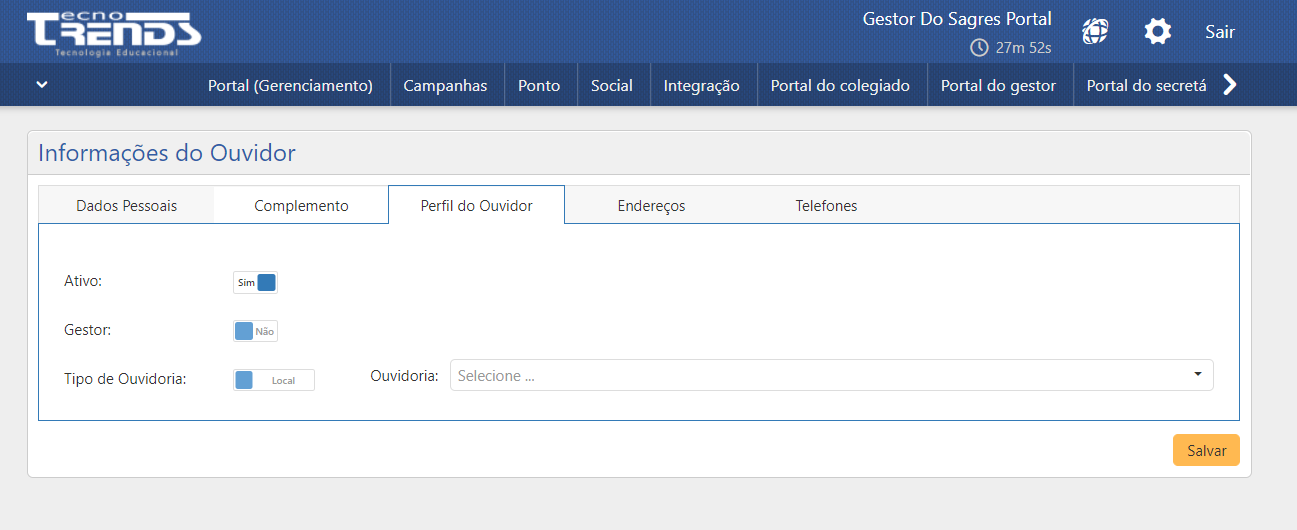 As informações são dividas em 5 abas: Dados Pessoais, Complemento, Perfil do Ouvidor, Endereços e Telefones.