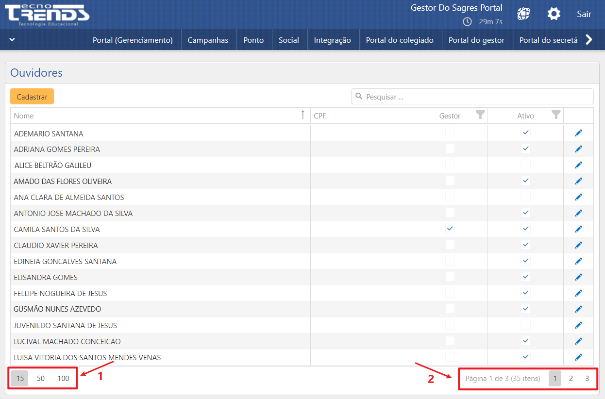 O número de usuários exibidos por página pode ser configurado ao selecionar uma das opções disponíveis no quadro indicado pela seta 1. A opção selecionada, consequentemente, determinará o número de páginas disponíveis para navegação. O número total de itens é exibido no quadro em destaque pela seta 2, bem como o número de páginas. Para navegar entre elas, selecione o número da página desejada.