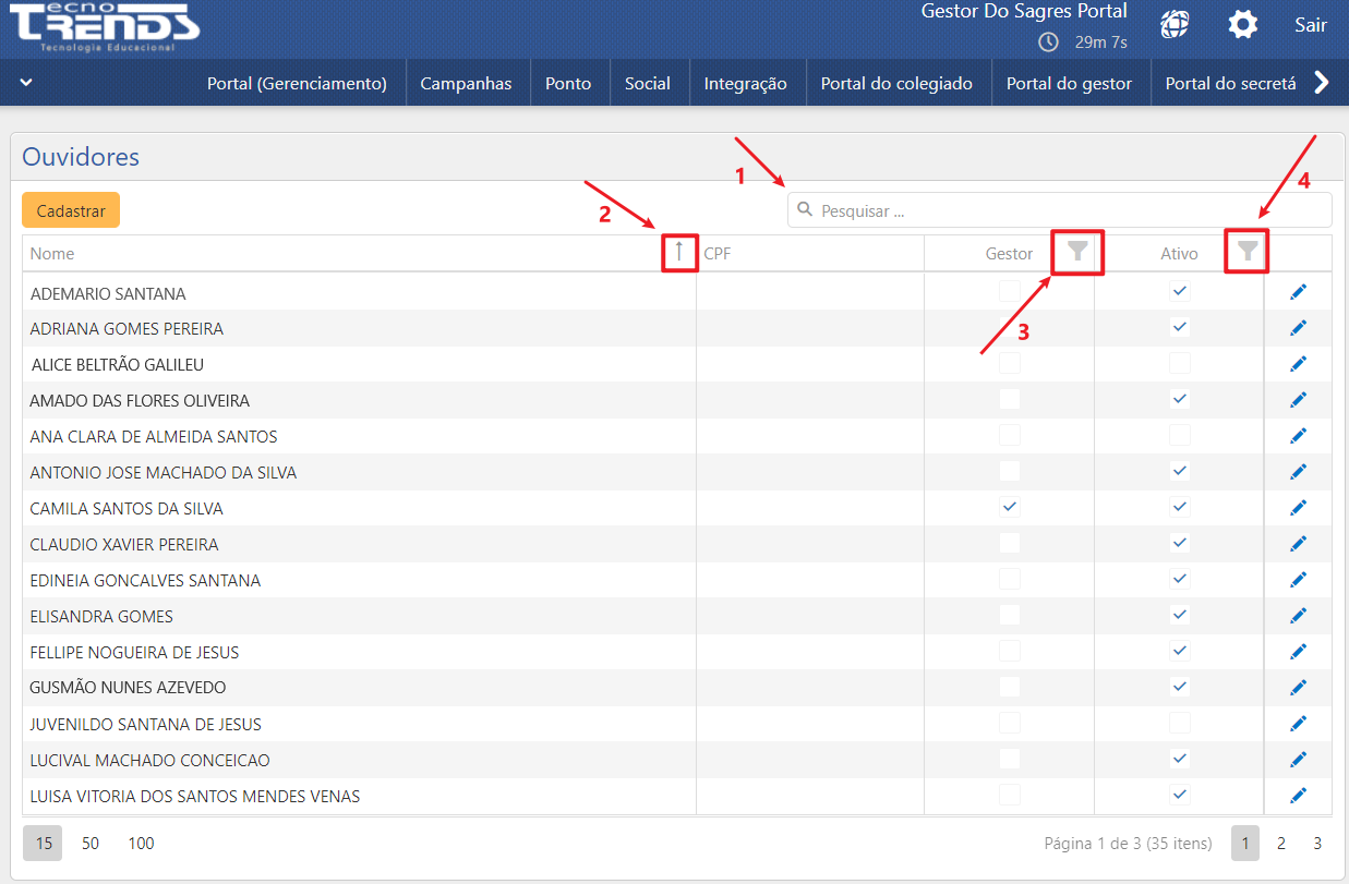 Através da ferramenta de pesquisa (seta 1), é possível buscar ouvidores na lista através do seu Nome ou CPF. É possível ainda utilizar filtros que permitem: a organização dos registros (nomes) listados por ordem alfabética crescente ou decrescente (seta 2), exibir apenas ouvidores gestores ou ouvidores comuns (seta 3) e filtrar apenas usuários ativos ou inativos (seta 4).